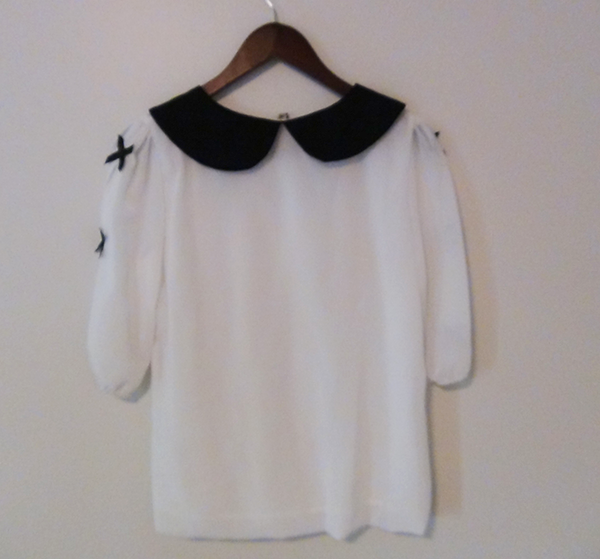the scalloped collar and little ribbon crosses detailing makes for a really sweet-looking blouse. tuck it into a pair of trousers to create a formal look or dress it down with a denim circle skirt.